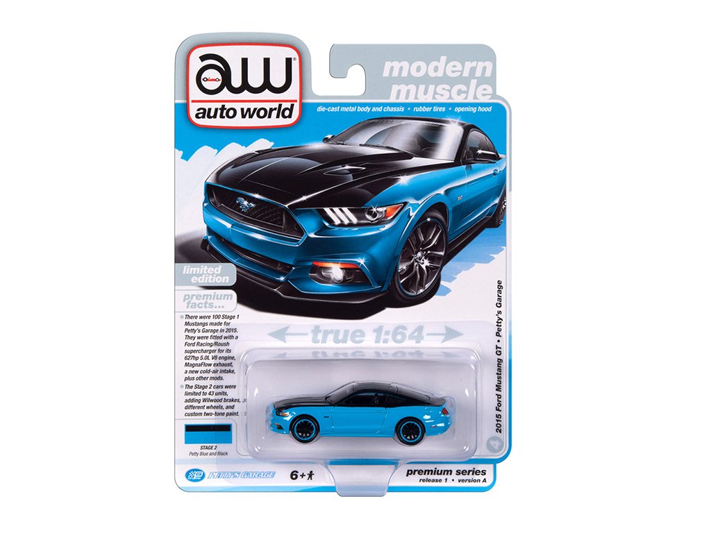 Ford Mustang GT Petty's Garage 2015 modrá 1:64 - Auto World Ford Mustang GT - kovový model auta 1/64